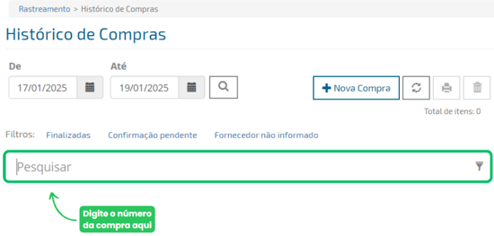 Passo 5: Você também pode filtrar seus resultados através do campo "Filtro". Digite o número da compra que deseja consultar para visualizar as suas informações.