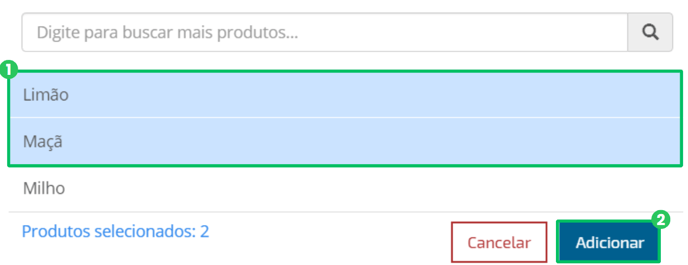 É possível selecionar mais de um produto em sua compra. Para isso, selecione os produtos desejados (1) e clique em "Adicionar" (2) para incluí-los na lista.