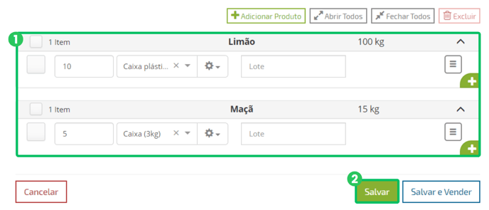 Passo 6: Caso queira cadastrar produtos de diferentes lotes ou embalagens, é só clicar em (1) e repetir o procedimento (2).
