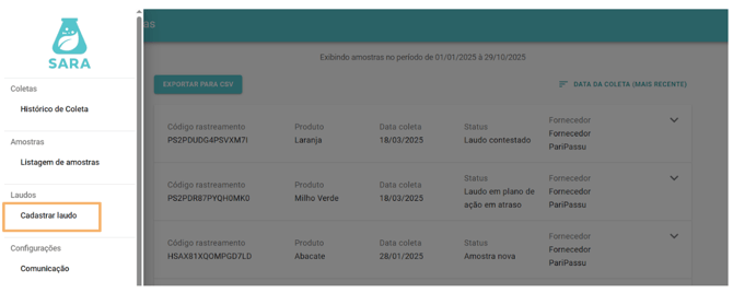 Passo 1: Para cadastrar seus laudos de resíduos de agrotóxicos de amostragem própria, basta acessar o menu lateral e clicar em “Cadastrar laudo”.