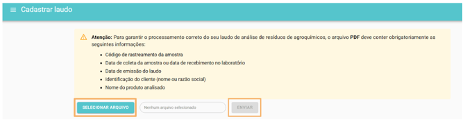 Passo 2: Clique em “Selecionar arquivo” para escolher o laudo que deseja cadastrar e, em seguida, em “Enviar”.